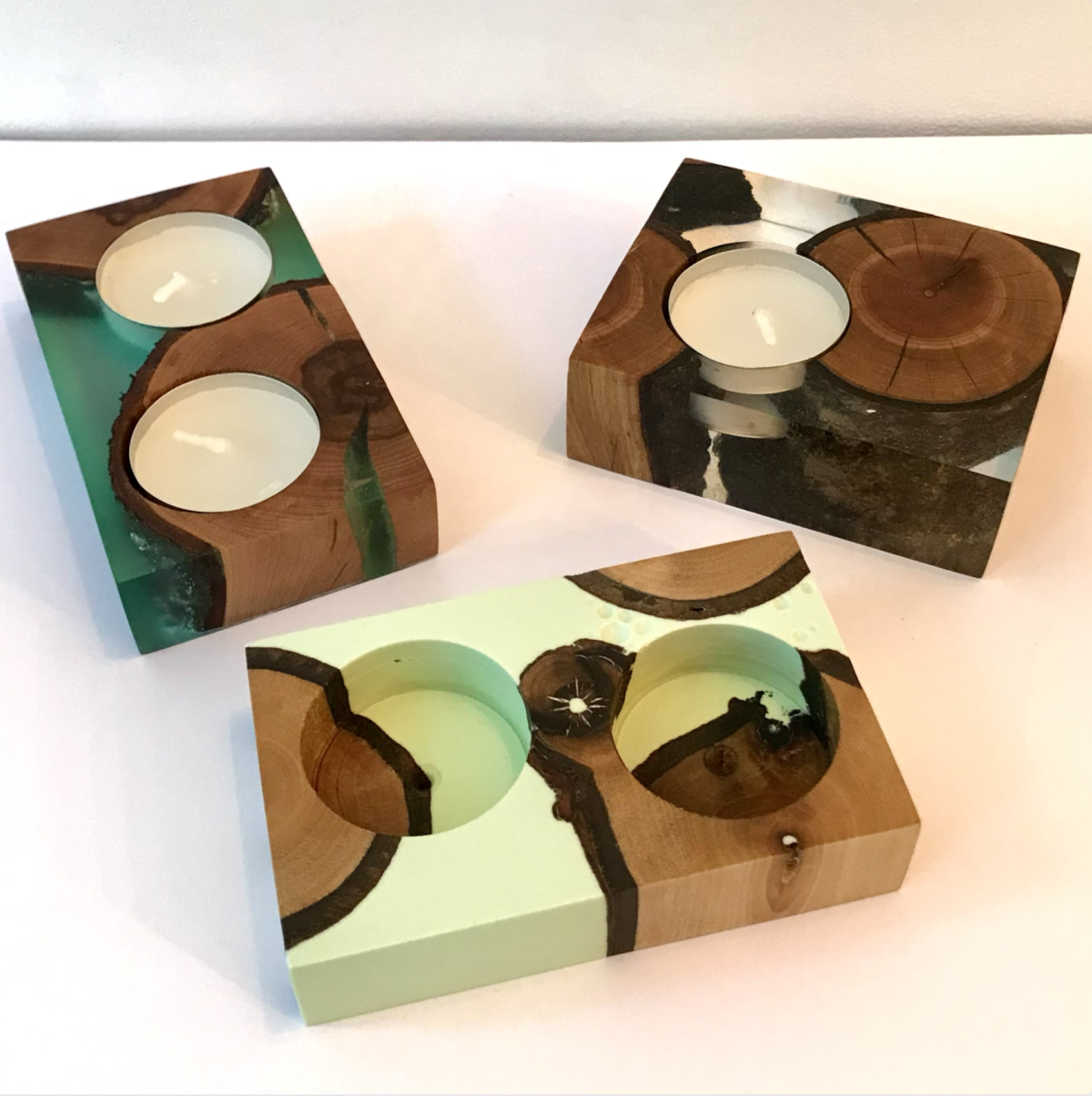 Bild 4: Epoxid-Kerzenständer für Teelichter. Verschiedene Farben und Formen. Ich verwende dabei Hölzer aus Oberurseler Gärten, wie Apfel/Kirsche/Pflaume/Walnuss/Birke,…. Preis je anch Größe: 34,-/38,- Euro