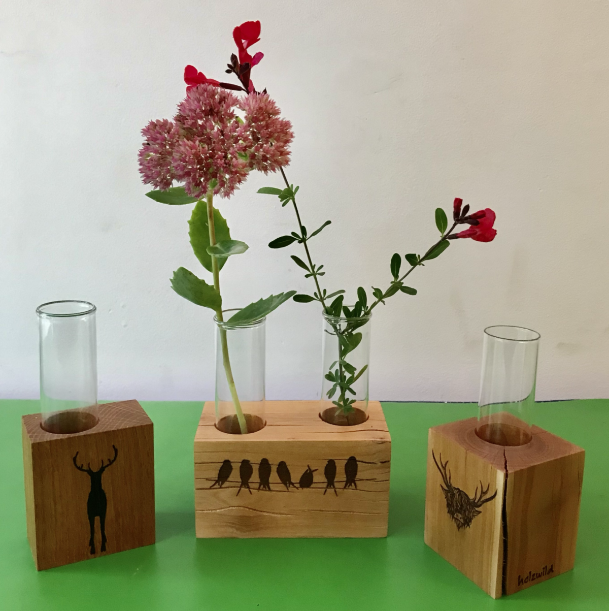 Bild 7: Holzvasen aus verschiedenen massiven Holzstücken, fein geschliffen und mit Lasergravur oder Goldverzierung. Auch hier verwende ich hauptsächlich Orscheler Holz. Die Größen variieren.
