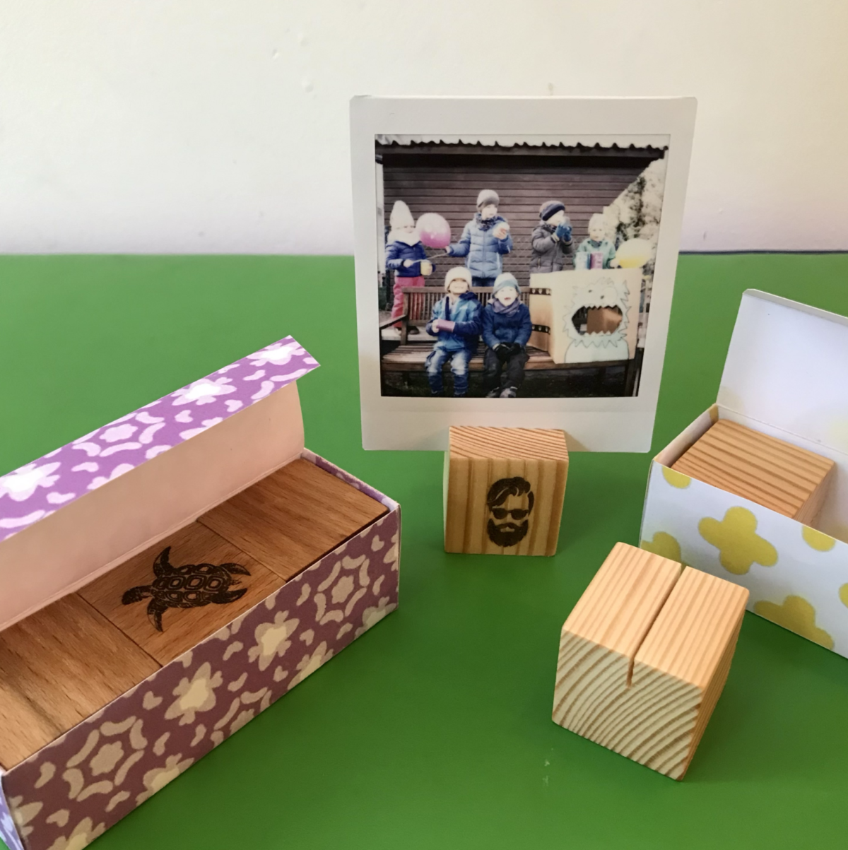 Bild 9: Wer zuhause Polaroids, Postkarten, Fotos oder ähnliches aufstellen möchte und dafür eine unkomplizierte, aufgeräumte Möglichkeit sucht, ist mit dem “Ständerle” gut bedient. Im Set sind jeweils 3 Holzwürfel mit einem Schlitz aus dunklerer Buche oder hellem Nadelholz in den Maßen 3x3x3 cm in einer schönen Geschenkverpackung. Einer der Würfel hat außerdem eine gelaserte Verzierung.