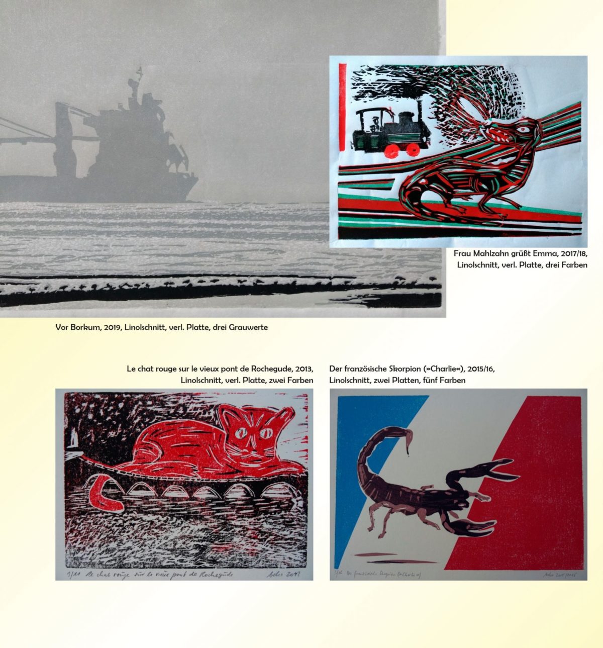 Linolschnitte – Bernhard Keßeler – als gelernter Journalist und langjähriger Redakteur hat mich die Aufbereitung der Informationen für den Druck – also Grafik und Layout – stets besonders interessiert. Wohl viele in Oberursel kennen die farbenfrohen Plakate, die den Orscheler Sommer verkünden … In meiner journalistischen Arbeit als Fachredakteur nahm der moderne Digitaldruck großen Raum ein. Vielleicht als Reflex darauf entwickelte sich vor gut zehn Jahren meine Leidenschaft für den »old fashion« Linoldruck. Mein Interesse gilt dabei besonders der grafischen Wirkung des Zusammenspiels von Formen und Farben. Neben einfachen figürlichen Darstellungen reizen mich auch abstrakte Formen. Der Arbeit mit mehreren Linoldruckplatten für ein Motiv stehen Schnitte mit der Technik der »verlorenen Platte« gegenüber. Bei dieser Technik wird die Platte zwischen zwei, drei und mehr Druckgängen weiter bearbeitet. Ein Zurück zum ersten Abzug gibt es dann nicht mehr … Erst mit dem letzten Druck wird deutlich, ob das Werk gelungen ist. In jüngster Zeit entstanden zudem Grafiken in reinen Grauwerten. Als Mitglied der KünstlerInnen-Gruppe »Farbwerke Oberursel« zeige ich meine Arbeiten seit 2015 in gemeinsamen Ausstellungen. 1953 geboren in Heidelberg, lebe ich seit 1998 in Oberursel.